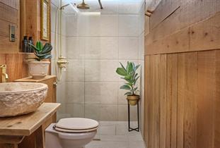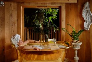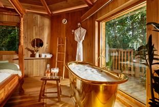 Nest Treehouse has been designed with outdoor bathing in mind. In your private courtyard you will find a wood fired hot tub, which is perfect for relaxing evenings after exploring the spectacular North Devon coast. If you prefer a bubble bath you have a choice of the most gorgeous double gold bath in the master bedroom or an outdoor bath hidden on the terrace.