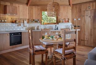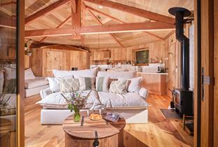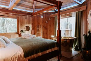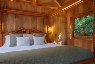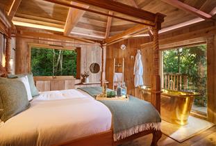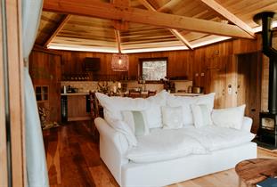 The treehouse also features a spacious open-plan living space with huge bifold doors on to the terrace, so you can enjoy the secluded and tranquil atmosphere and bring the outside in. Take your time and cook a delicious meal and enjoy a glass of wine by the fire or on the terrace listening to the sounds of nature.
